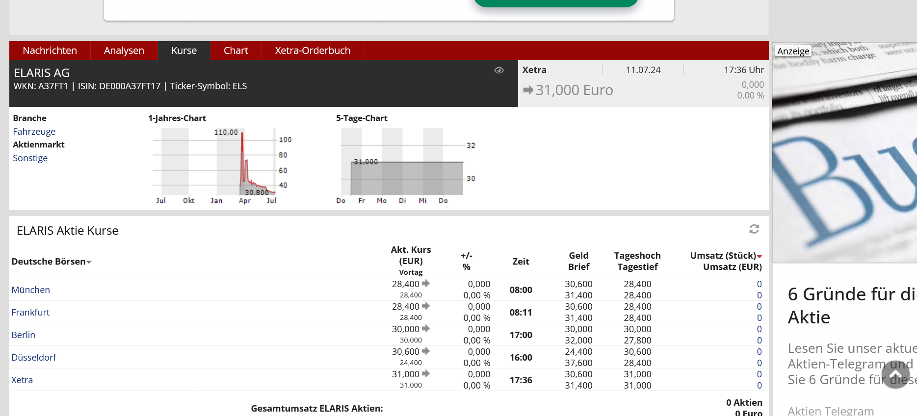 Geht es nach dem aktuellen Screenshot vom heutigen Abend, dann kann man genau dies aus diesem Screenshot ersehen. Warum gibt es eigentlich solch eine geringe Nachfrage nach den von Lars Stevenson so hochgelobten Aktien der ELARIS AG? Elaris ist meines Wissens ja nicht nur in Deutschland aktiv, sondern auch in anderen europäischen Ländern. Genau deshalb, sehr geehrter Herr Stevenson, sollten Sie möglicherweise einmal detaillierte Verkaufs- und Zulassungszahlen Ihres Unternehmens veröffentlichen.