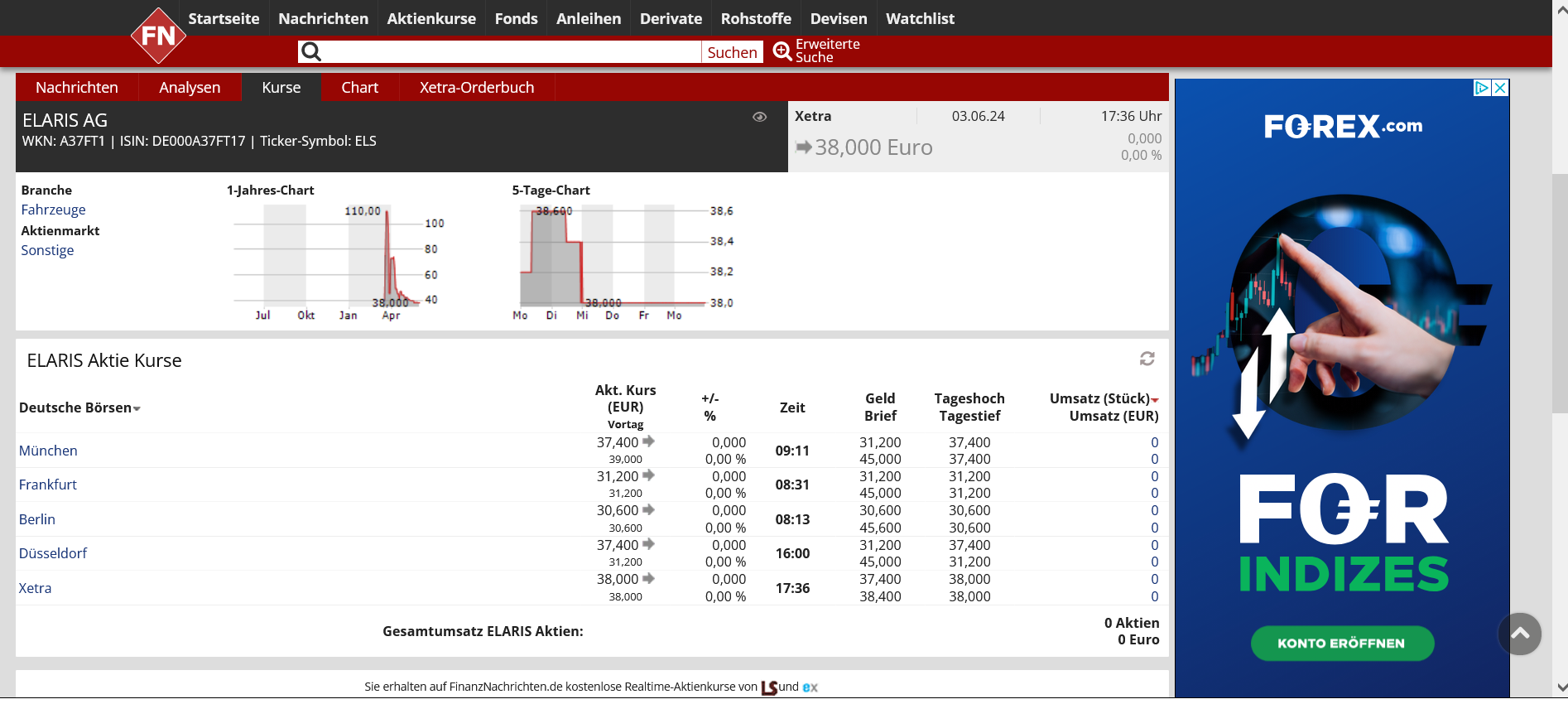 Zumindest was die Nachfrage und den möglichen Verkauf von Elaris AG angeht, denn wie Sie nachfolgendem Screenshot entnehmen können, wieder ein 0er Tag. Etwas nicht Ungewöhnliches für das Papier des Unternehmens ELARIS AG von CEO Lars Stevenson. Möglicherweise fehlt ja bei vielen Shareholdern einfach das Vertrauen in das Unternehmen bzw. ist ihnen ein Investment in die Automobilsparte einfach zu waghalsig, denn die befindet sich ja derzeit ganz klar im Umbruch. Interessant sicherlich auch, was in den nächsten Tagen bzw. Wochen möglicherweise an Zoll für E-Autos aus China beschlossen werden könnte. Das könnte dann auch das Unternehmen ELARIS AG betreffen. Schauen wir mal, wie es in den nächsten Tagen und Wochen weitergeht mit dem Unternehmen.