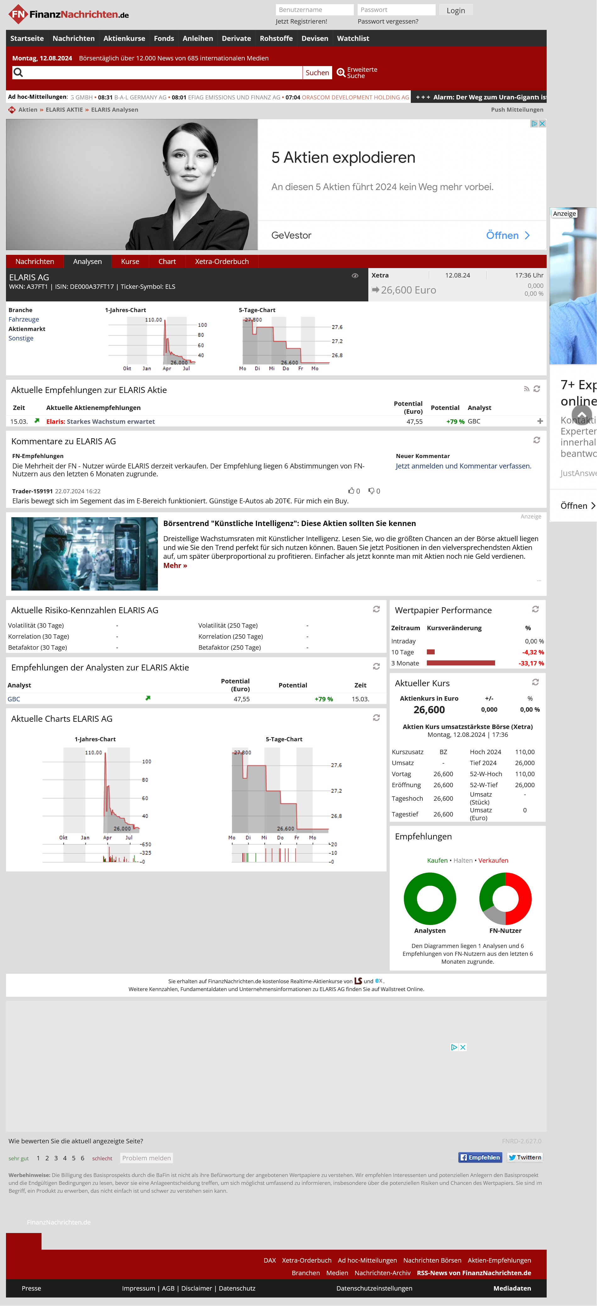 Auch heute kein Jubeltag für das Unternehmen Elaris AG aus Grünstadt und seinen CEO Lars Stevenson, denn die Woche fängt, vom Aktienverkauf her, nicht gut an. Hoffen wir dann mal, dass man mehr Autos als Aktien verkauft. Das wäre dann ja sicherlich ein Fortschritt und ein guter Weg, um die Umsatzprognose zu erfüllen, die man ja bereits einmal korrigieren musste.