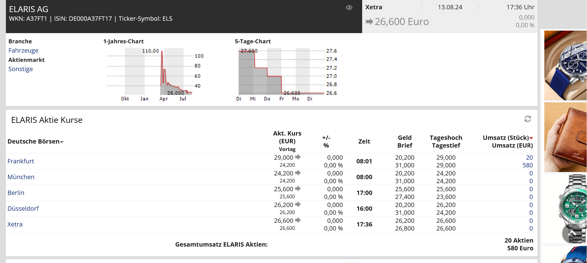Heute hat man in der Tat einmal 20 Aktien verkauft, wirklich ein positiver Erfolg CEO Lars Stevenson, udn natürlich steigt der Aktienkurs dann gleich mit heute auf sagenhafte 29 Euro. Auch wenn es letztlich nur 20 Aktien waren die gehandelt wurden, sehen wir das ganz klar als Erfolg, denn bei den vilen 0 er Tagen der Vergangenheit.