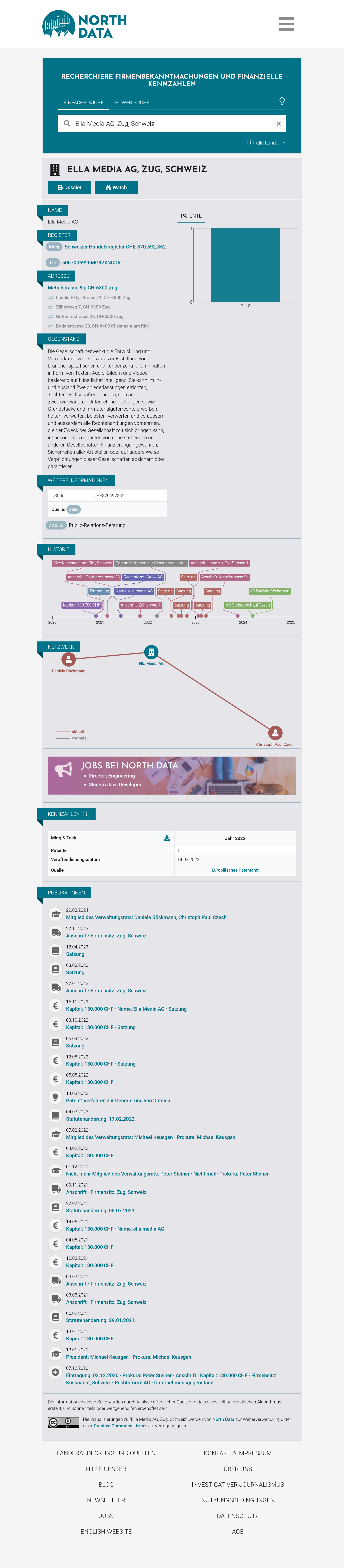 Ella Media AG, in Zug, Schweizer Handelsregister CHE-370.592.352, Aktiengesellschaft (SHAB Nr. 230 vom 27.11.2023, Publ. 1005894304). Eingetragene Personen neu oder mutierend: Böckmann, Dr. Daniela, deutsche Staatsangehörige, in Ingenbohl, Mitglied der Geschäftsleitung, mit Kollektivunterschrift zu zweien; Czech, Christoph Paul, deutscher Staatsangehöriger, in Friedrichsdorf (DE), Mitglied der Geschäftsleitung, mit Kollektivunterschrift zu zweien.