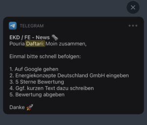 Auffallend sind die vielen schlechten Bewertungen, die man von Ihnen finden kann, aber in der Tat auch einige gute, die aber dann irgendwie „so geschliffen aussehen“. Nun hat uns ein ehemaliger Mitarbeiter Ihres Vertriebs einen Screenshot übermittelt. Einen Screenshot, der sicherlich erklärungsbedürftig ist.