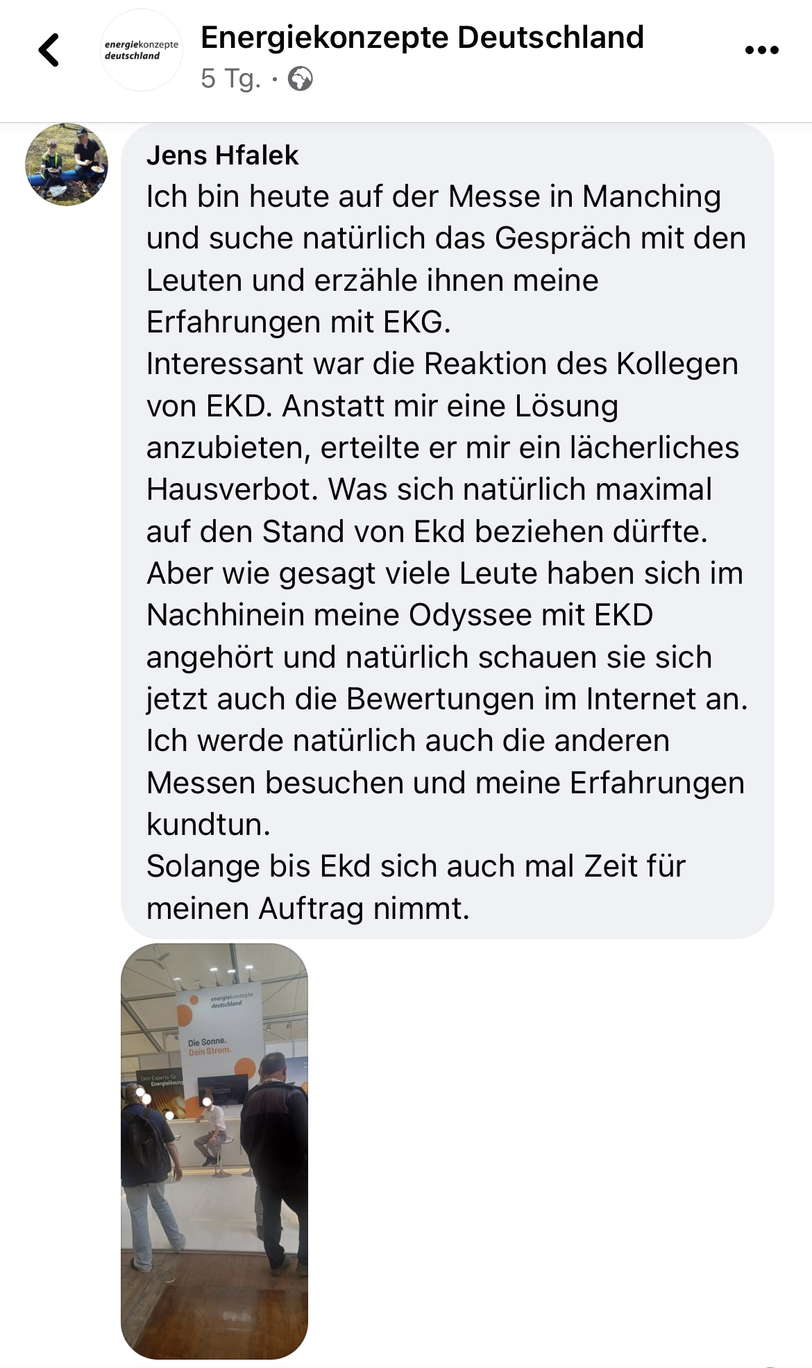 Zu diesem Kommentar muss man dann nicht mehr viel sagen, meine Herrn Geschäftsführer des Unternehmens EKD Solar. Lösen Sie doch endlich das Problem des Kunden und schon haben sich solche Besuche erledigt. Darauf mit einem Hausverbot auf einer Messe zu reagieren, ist sicherlich eine merk-würdige Reaktion.