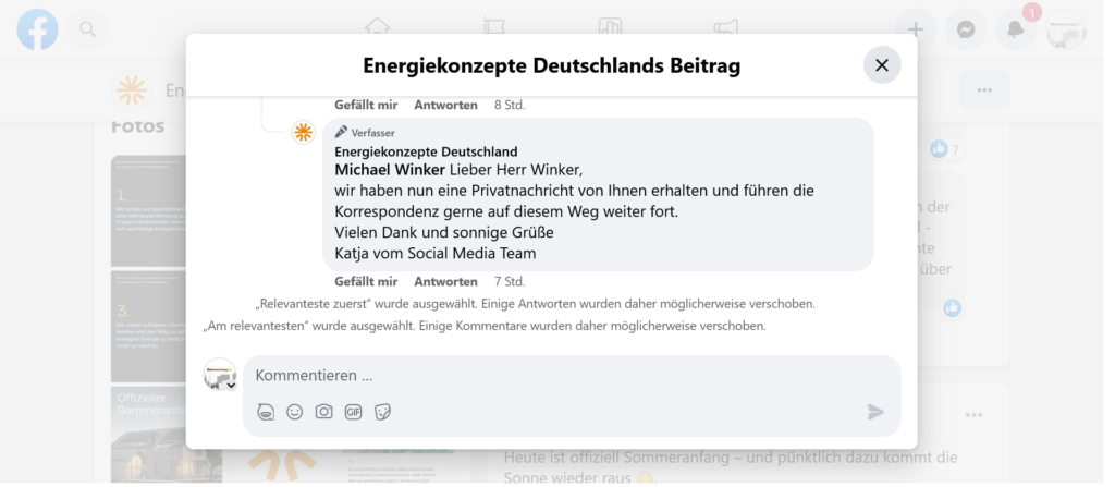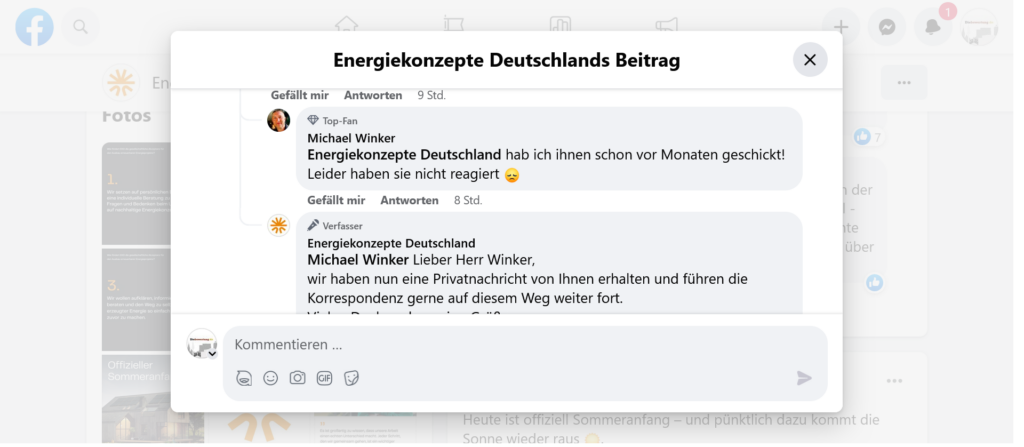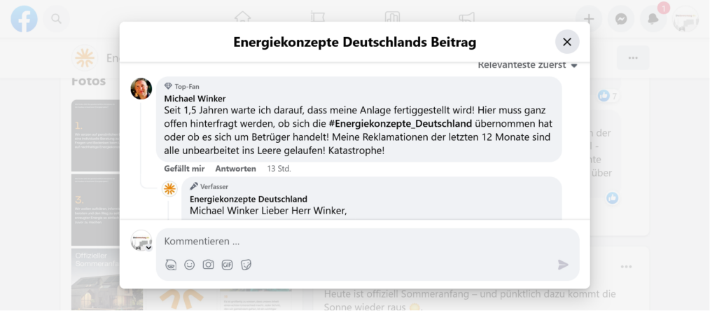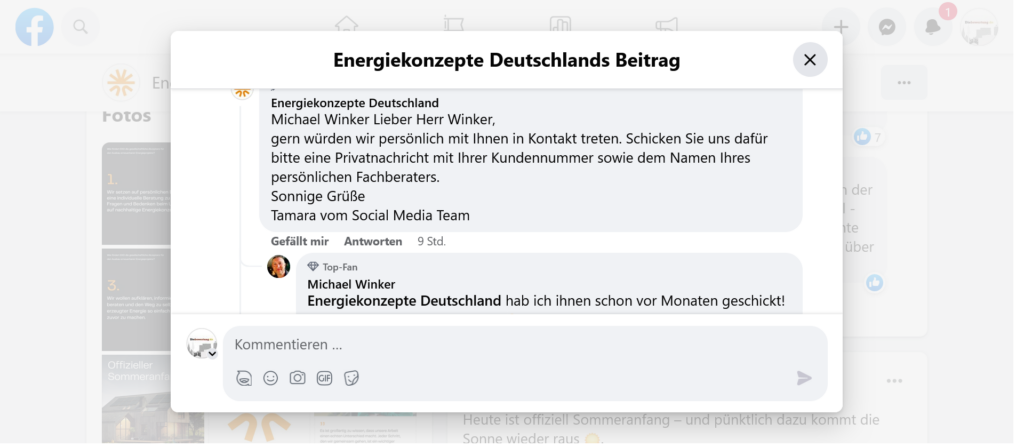 Zudem hat uns ein User einen Kommentarverlauf mit dem Unternehmen gezeigt, den er als „Zumutung bzw. Unverschämtheit“ empfindet, denn natürlich hat er sich mit dem Unternehmen nicht jetzt erst in Verbindung gesetzt, auch wenn das „Social-lie-team“ -sarkastisch gemeint von unserem User- diesen Eindruck erwecken will. EKD Solar so seine Meinung, bitte nicht.