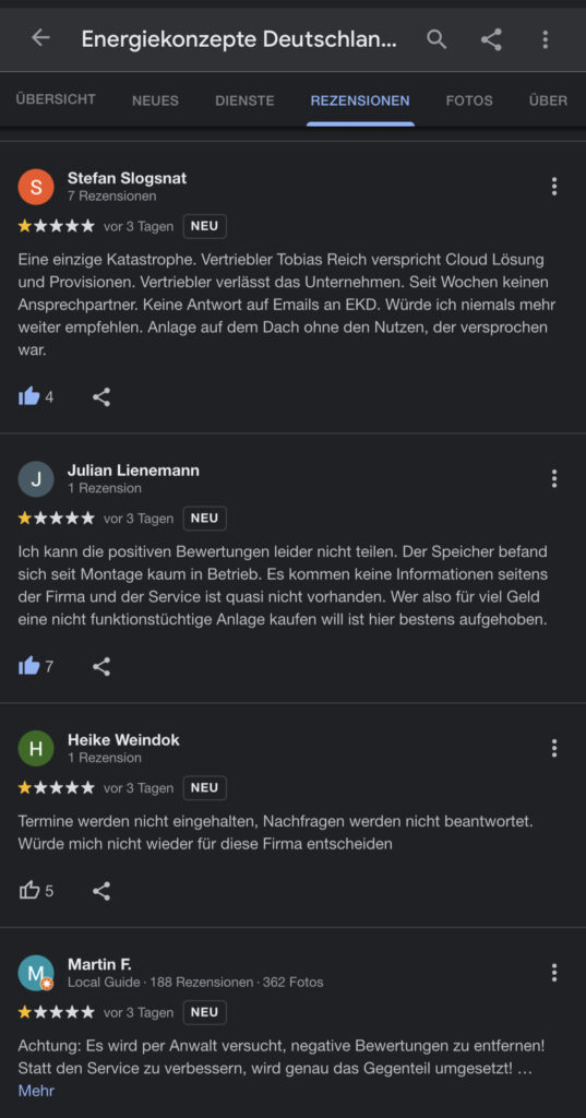 Nicht nur bei Trustpilot gibt es kritische Kommentare für EKD Solar Deutschland, nein auch bei Google findet man leider mehr und mehr solcher Kommentare.