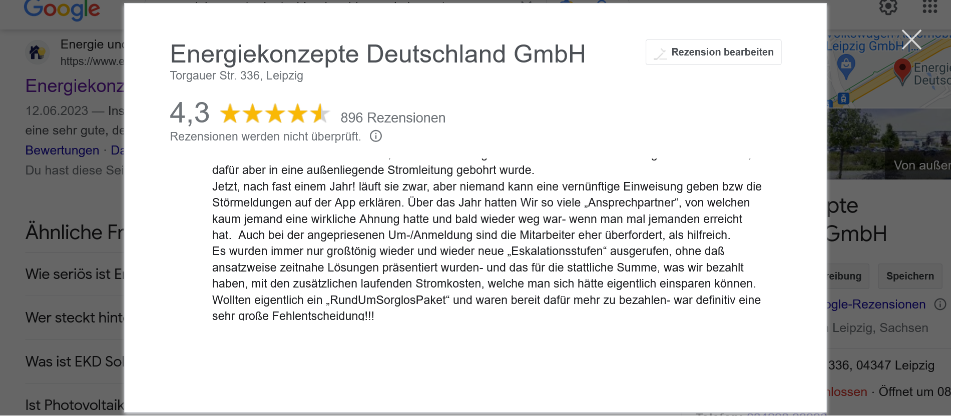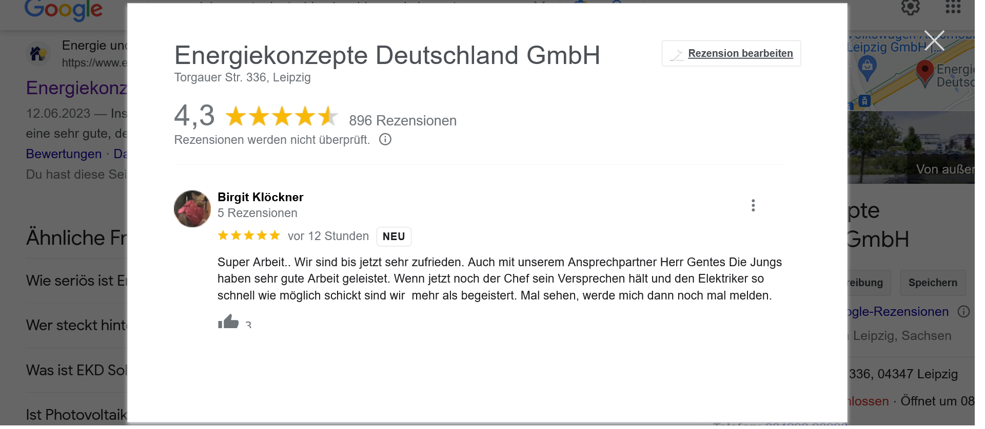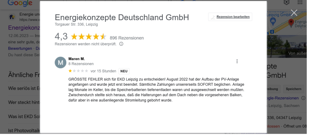 Auch jetzt gibt es wieder neue Kommentare zum Unternehmen Energiekonzepte Deutschland GmbH. Selbst den positiven Kommentar muss man dann möglicherweise kritisch sehen, denn genau das mit dem Elektriker ist oft der Kritikpunkt bei unzufriedenen Kunden. Da sind wir dann auf einen neuen Bericht gespannt, wann dann der Elektriker kommt.