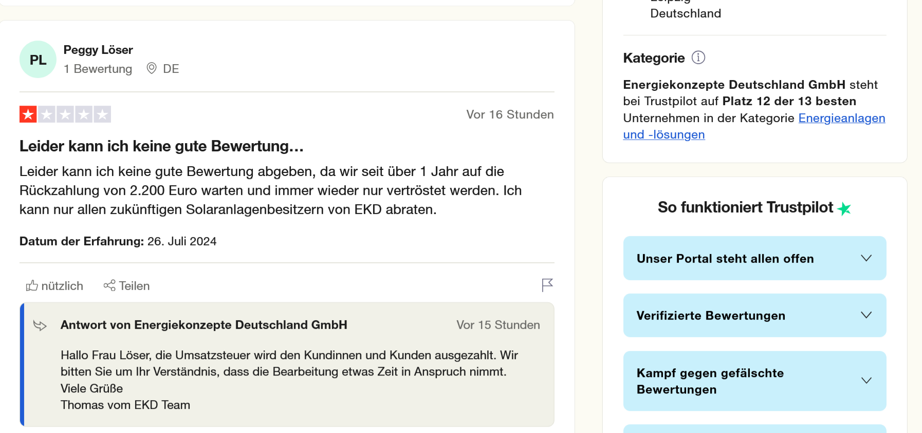 Leider kann ich keine gute Bewertung abgeben, da wir seit über 1 Jahr auf die Rückzahlung von 2.200 Euro warten und immer wieder nur vertröstet werden. Ich kann nur allen zukünftigen Solaranlagenbesitzern von EKD abraten.