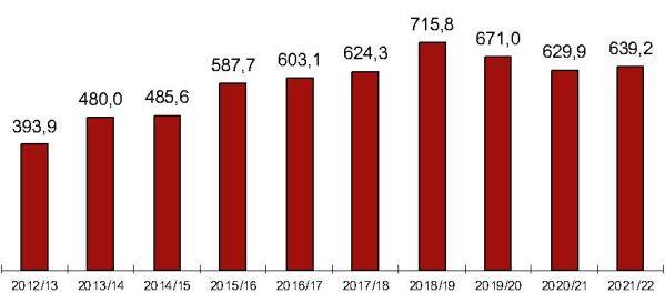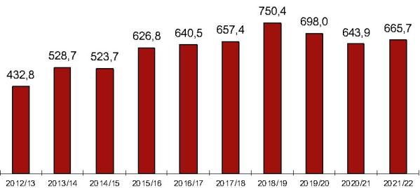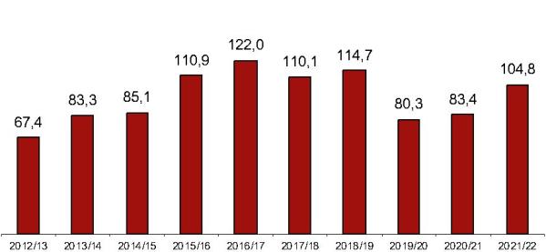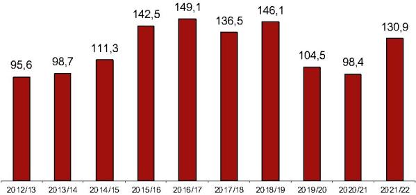 Die im Vorjahr für die Saison 2021/2022 vom Vorstand betont vorsichtig aufgestellte Prognose für die Entwicklung der Umsätze, ein weiterer Rückgang um 10% – 15% im Vergleich zum Umsatz 2020/2021, konnte deutlich übertroffen werden: Der Konzernumsatz ist von € 635,5 Mio. im Geschäftsjahr 2020/2021 auf € 648,6 Mio. gestiegen. Die Öffnung der Stadien und damit einhergehend die Möglichkeit, spieltagsbezogene Leistungen gegenüber den Sponsoren aus der Vorsaison nachholen zu können und die Kooperation mit diesen Sponsoren haben sich hier deutlich ausgewirkt.