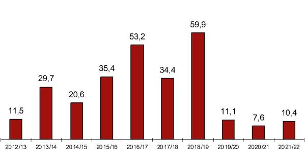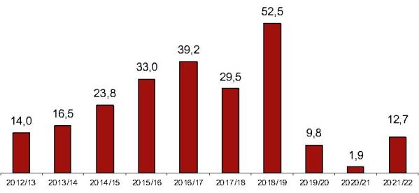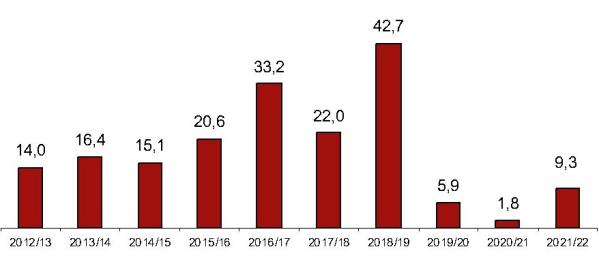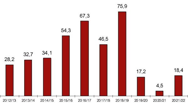 Die Erlöse im Bereich der medialen Verwertungsrechte resultieren überwiegend aus der zentralen Vermarktung dieser Rechte durch die DFL (Bundesliga) und dem DFB (DFB-Pokal). Infolge der Covid-19-Pandemie gab es bei der medialen Zentral-Vermarktung der Bundesliga Zahlungsausfälle und Kompensationsrückzahlungen. Diese zum Teil erheblichen Rückgänge insbesondere bei der Auslandsvermarktung haben sich entsprechend deutlich auf die Einnahmen der FC BAYERN MÜNCHEN AG ausgewirkt. Außerdem begann mit der Saison 2021/2022 die neue, vierjährige Vermarktungsperiode der medialen Rechte, für die die DFL nicht mehr an die vorherigen Einnahmen anknüpfen konnte. Während die Einnahmen hier schon 2019/2020 gegenüber den Vorjahren zurückgingen, waren sie nun im abgelaufenen Geschäftsjahr noch einmal deutlich um fast 19% rückläufig. Teilweise kompensiert werden konnte der Rückgang durch den Sondereffekt der Einnahmen aus der Amazon Dokumentation „Behind The Legend“