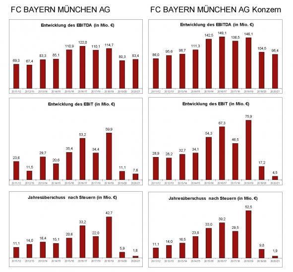 Das Jahresergebnis 2020/2021 im Konzern beträgt € 1,9 Mio. gegenüber € 9,8 Mio. im Vorjahr. Die FC BAYERN MÜNCHEN AG erzielte einen Jahresüberschuss von € 1,8 Mio. (VJ € 5,9 Mio.).