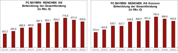 Die Umsatzerlöse des FC BAYERN MÜNCHEN AG Konzerns gingen im Geschäftsjahr 2020/2021 von € 678,3 Mio. im Vorjahr auf € 635,5 Mio. zurück. Die sonstigen betrieblichen Erträge sind gegenüber dem Vorjahr von € 19,6 Mio. auf € 8,4 Mio. gesunken. Die Gesamtleistung des Konzerns ist somit in Summe von € 698,0 Mio. im Vorjahr auf € 643,9 Mio. gesunken.