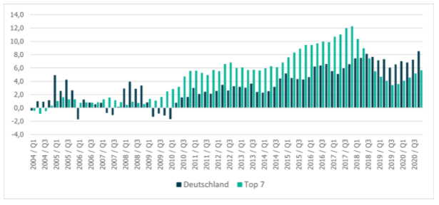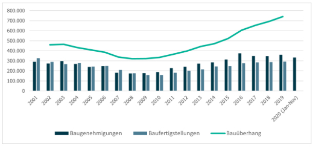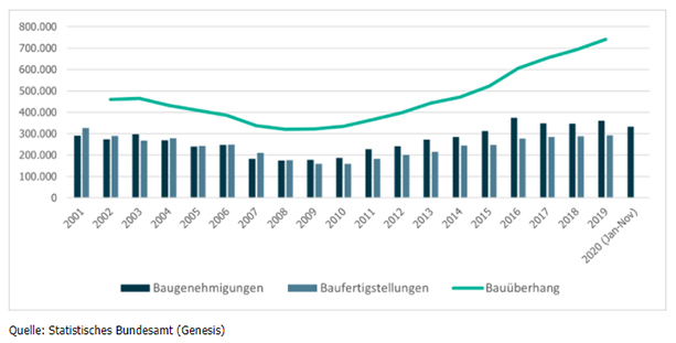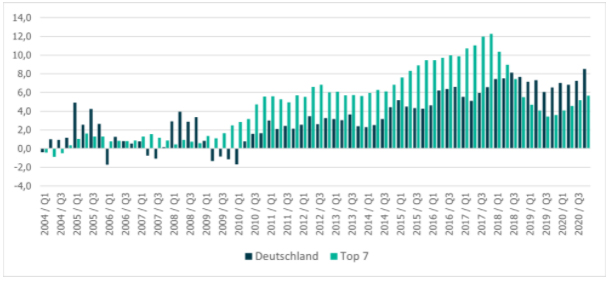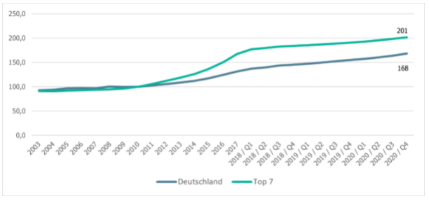Quelle: JLL Die Neuvertragsmieten für Einzelhandelsimmobilien gaben laut vdpResearch 2020 hingegen weiter nach. Der Indexwert lag im vierten Quartal 2020 um 1,4 %-punkte niedriger als im Vorjahresquartal. Für das Gesamtjahr 2020 verzeichnet der Indexwert eine Verringerung um 1,8 %-punkte – das zweite Jahr mit sinkenden Mieten in Folge. Die Dynamik des Rückgangs hat sich im Vergleich zum Vorjahr, als das Minus 0,3 %-punkte betrug, deutlich erhöht. INDEXIERTE ENTWICKLUNG DER NEUVERTRAGSMIETEN FÜR EINZELHANDELSIMMOBILIEN IN DEUTSCHLAND ![]() Quelle: vdpResearch, (Index: 2010 = 100) Entgegen der vergangenen Jahre zeigen die Spitzenrenditen für innerstädtische Geschäftshäuser erste Aufwärtstendenzen. So verzeichnen Düsseldorf, Köln und Stuttgart jeweils einen Anstieg um 0,1 %-punkte, während die Spitzenrenditen in Berlin, Frankfurt am Main, Hamburg und München 2020 konstant geblieben sind. Laut COMFORT haben die Spitzenmieten im Einzelhandel in 1A-Lagen in Augsburg trotz steigendem Umsatz nachgegeben. In der Größenklasse von 80 bis 120 qm Fläche sank die Spitzenmiete von 65 auf 55 €/qm und in der Größenklasse von 300 bis 500 qm von 35 auf 30 €/qm. Dennoch ist Augsburg ein attraktiver Einzelhandelsstandort. Dies verdeutlicht der COMFORT High Streets Report, der die Stadt auf Rang 18 der attraktivsten Einzelhandelsstandorte Deutschlands führt. Wohnimmobilienmarkt Die Bauaktivität in Deutschland nimmt weiter Fahrt auf. Laut Statistischem Bundesamt wurden 2019 insgesamt 293.002 neue Wohnungen errichtet und damit die höchste Fertigstellungzahl seit 2001 erreicht. Die Zahl der Baugenehmigungen bleibt ebenfalls auf einem hohen Niveau: 360.493 Genehmigungen wurden 2019 erteilt. Für den Zeitraum von Januar bis November 2020 waren es 332.574 Baugenehmigungen. Es ist davon auszugehen, dass die anhaltenden Engpässe in der Bauindustrie, die durch unterbrochene Lieferketten und temporäre Baustellenschließungen aufgrund des Coronavirus noch weiter verstärkt wurden, weiterhin zu einem Anstieg des Bauüberhangs führen – Wohnungen, für die zwar eine Baugenehmigung erteilt wurde, die jedoch noch nicht als fertiggestellt gemeldet sind. 2019 betrug der Bauüberhang 740.400 Wohnungen. Wohnimmobilien haben sich im Laufe der Corona-Krise als stabile Assetklasse erwiesen und avancieren zum sicheren Hafen für Investoren. Ca. 25,2 Mrd. € flossen 2020 in diese Nutzungsart – rund 3 Mrd. € mehr als 2019 und damit erstmals mehr als in Büroimmobilien (24,5 Mrd. €). ENTWICKLUNG DER BAUGENEHMIGUNGEN, -FERTIGSTELLUNGEN UND DES BAUÜBERHANGS IN DEUTSCHLAND ![]() Quelle: Statistisches Bundesamt (Genesis) Laut CBRE-empirica-Leerstandsindex 2020 stagniert der Leerstand von Geschosswohnungen erstmals nach zwölf Jahren rückläufiger Entwicklung und verharrt bundesweit bei seinem Rekordtiefstand von 2,8 %. Große Unterschiede ergeben sich zwischen Wachstums- und Schrumpfungsregionen. In letzteren erhöhte sich der Leerstand auf durchschnittlich 8,6 %, wohingegen erstere einen mittlerweile 13 Jahre anhaltenden Rückgang verzeichnen auf nunmehr 1,9 %. Der niedrigste Leerstand ist mit jeweils 0,2 % in München und Frankfurt am Main vorzufinden. Ein besonders starkes Absinken der Leerstandsquote seit 2014 verzeichnet Leipzig. Der Wert in der sächsischen Großstadt sank hier um 3,2 %-punkte auf 2,8 % und halbierte sich damit praktisch. Die Preise für selbstgenutztes Wohneigentum haben sich gemäß vdpResearch 2020 etwas dynamischer erhöht als noch im Jahr 2019. Der Indexwert für die sieben A-Städte stieg zum vierten Quartal 2020 um 10,8 %-punkte gegenüber dem Vorjahresquartal auf 201,4. Damit haben sich die Preise seit 2010 mehr als verdoppelt. Deutschland verzeichnet ein Plus von 13,2 %-punkte auf 168,0. INDEXIERTE ENTWICKLUNG DER PREISE FÜR SELBST GENUTZTES WOHNEIGENTUM IN DEUTSCHLAND UND DEN A-STÄDTEN ![]() Quelle: vdpResearch, (Index 2010 = 100) Bereits seit dem dritten Quartal 2018 übersteigt das Preiswachstum in ganz Deutschland jenes der A-Städte. Grund dafür ist das hohe Preisniveau, das keine großen Preissprünge mehr zulässt. Dennoch hat die Wachstumsdynamik wieder Fahrt aufgenommen – trotz des schwierigen wirtschaftlichen Umfeldes aufgrund der Einschränkungen zur Eindämmung des Coronavirus. Den größten Sprung machte Hamburg mit einem Zuwachs um 13,1 %-punkte auf einen Indexwert von 189,7, gefolgt von München mit einem Anstieg um 12,4 %-punkte auf 213,5. Die stärkste Preisentwicklung seit 2010 hat in Berlin stattgefunden. Die Bundeshauptstadt erreichte im vierten Quartal 2020 einen Indexwert von 229,5. Wesentlich weniger dynamisch haben sich die Neuvertragsmieten entwickelt. Der Indexwert in Deutschland stieg im vierten Quartal 2020 auf 145,9 und lag damit 4,1 %-punkte über dem Vorjahreswert. Etwas weniger stark haben sich die Mieten in den A-Städten erhöht. Der Zuwachs betrug 2,7 %-punkte auf einen Indexwert von 167,1. Die stärkste Performance zeigten die Mieten in Hamburg mit einem Plus von 6,2 %-punkten, gefolgt von Köln mit 4,7 %-punkten. Unter den sieben A-Städten konnte einzig Berlin kein Wachstum vorweisen, was zum großen Teil auf die Einführung des Mietendeckels im Februar 2020 zurückzuführen ist. JÄHRLICHE PREISÄNDERUNG FÜR SELBST GENUTZTES WOHNEIGENTUM IN DEUTSCHLAND UND DEN A-STÄDTEN (ENTWICKLUNG GEGENÜBER DEM VORJAHRESQUARTAL IN %) ![]() Quelle: vdpResearch Laut Prognosemodell des IW Köln werden von 2021 bis 2025 jährlich gut 260.000 neue Wohnungen deutschlandweit benötigt. Die Zahl der Baufertigstellungen hat in den vergangenen Jahren zwar deutlich zugenommen, dennoch konnte der vom IW für den Zeitraum 2016 bis 2020 kalkulierte Bedarf von jährlich 341.700 bei weitem nicht erreicht werden. Allein zwischen 2016 und 2019 hat sich ein rechnerisches Defizit von gut 225.000 benötigten Wohnungen aufgebaut. Für die sieben A-Städte beträgt das Defizit rund 72.000 Wohnungen. Hamburg weist mit 84 % Bedarfsdeckung die höchste Erfolgsq