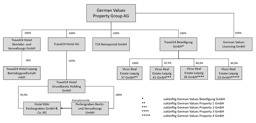 Die German Values Property Group AG (ehemals Travel24.com AG) ist die Konzernobergesellschaft des Konzerns „German Values Property Group“ (im Folgenden für den Konzern German Values Property Group). In den Segmenten Immobilien und Hotellerie hält die German Values Property Group zum Berichtszeitpunkt an den zuletzt berichteten Zielen und der geplanten Strategie fest. Im Segment Internet hält die German Values Property Group an ihrer Entscheidung fest. Die Geschäftstätigkeit ist bis auf Weiteres eingestellt. Das Reisevermittlungsgeschäft wurde bereits eingestellt. Die Einstellung des Flugvermittlungsgeschäfts ist zum Berichtszeitpunkt noch nicht final abgeschlossen.
