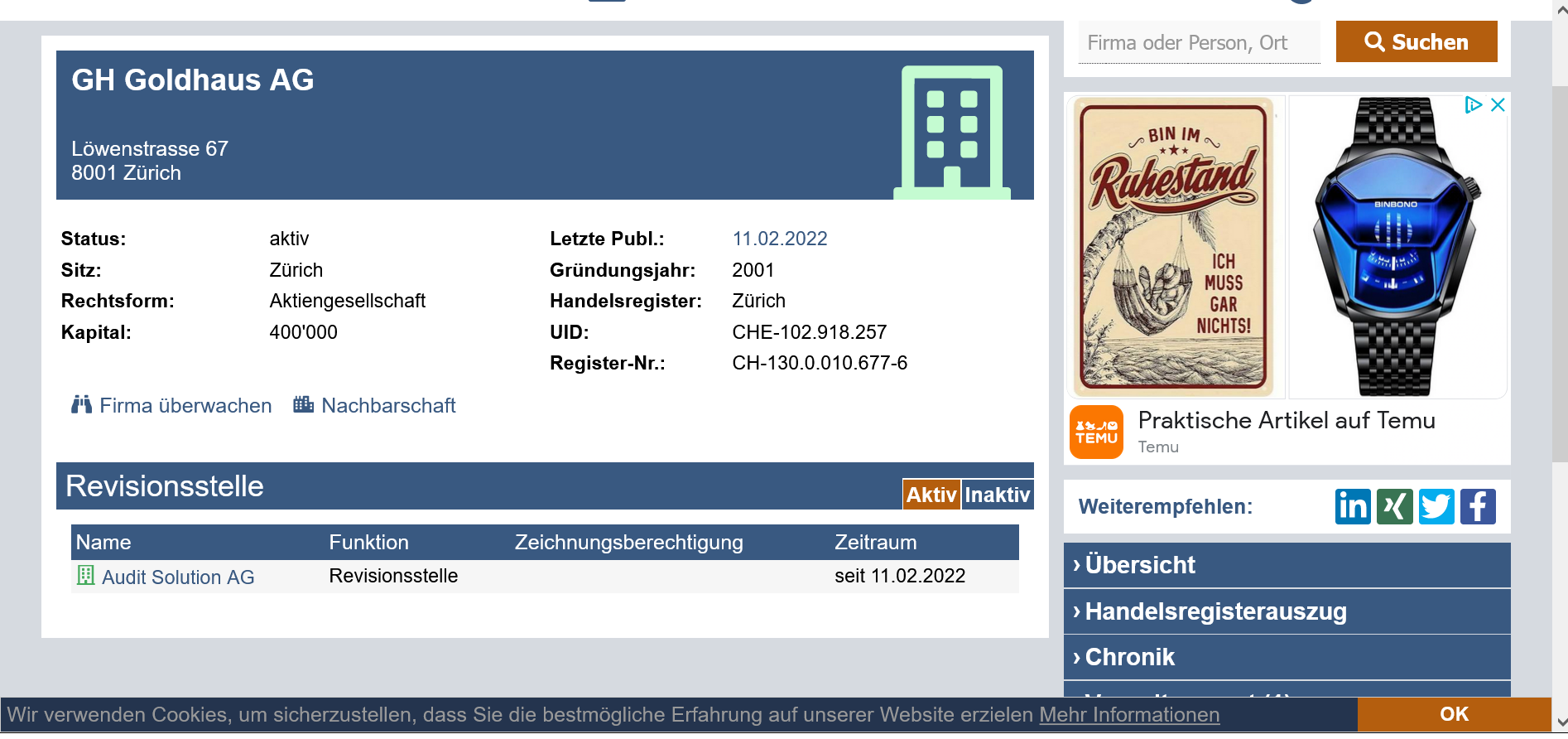 Festgestellt haben wir aber auch, das die Revisionsstelle für dieses Unternehmen auch die Audit Solution AG benannt wird. Jenes Unternehmen weches wir auch als Revisionsstelle der Swiss Gold Treuhand AG kennen. Jenes Unternehmen zu dem wir gerade im Goldbereich eine Interessengemeinschaft gegründet haben.