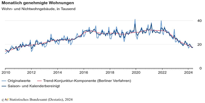 Ergänzend hierzu hat das Statistische Bundesamt (Destatis) in seiner Pressemitteilung Nr. 278 vom 18. Juli 2024, zu finden unter https://www.destatis.de/DE/Presse/Pressemitteilungen/2024/07/PD24_278_3111.html folgendes festgestellt: „Im Mai 2024 wurde in Deutschland der Bau von 17 800 Wohnungen genehmigt. Wie das Statistische Bundesamt (Destatis) mitteilt, waren das 24,2 % oder 5 700 Baugenehmigungen weniger als im Mai 2023. Im Vergleich zum Mai 2022 sank die Zahl der Baugenehmigungen sogar um 43,9 % oder 13 900 Wohnungen. Von Januar bis Mai 2024 wurden 89 000 Wohnungen genehmigt. Das waren 21,5 % oder 24 400 Wohnungen weniger als im Vorjahreszeitraum. In diesen Ergebnissen sind sowohl Baugenehmigungen für Wohnungen in neuen Wohn- und Nichtwohngebäuden als auch für neue Wohnungen in bestehenden Gebäuden enthalten.“