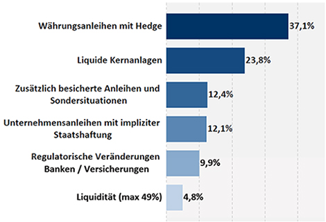 Durch die konsequente Nutzung von Marktineffizienzen, Renditevorteilen aus überwiegend wechselkursgesicherten Anlagen in Fremdwährungen als auch durch die Nutzung von Illiquiditätsprämien für Investitionen innerhalb des Zeithorizonts des Laufzeitfonds, konnten zahlreiche Anleihen mit Renditen deutlich über dem üblichen Marktniveau erworben werden.
