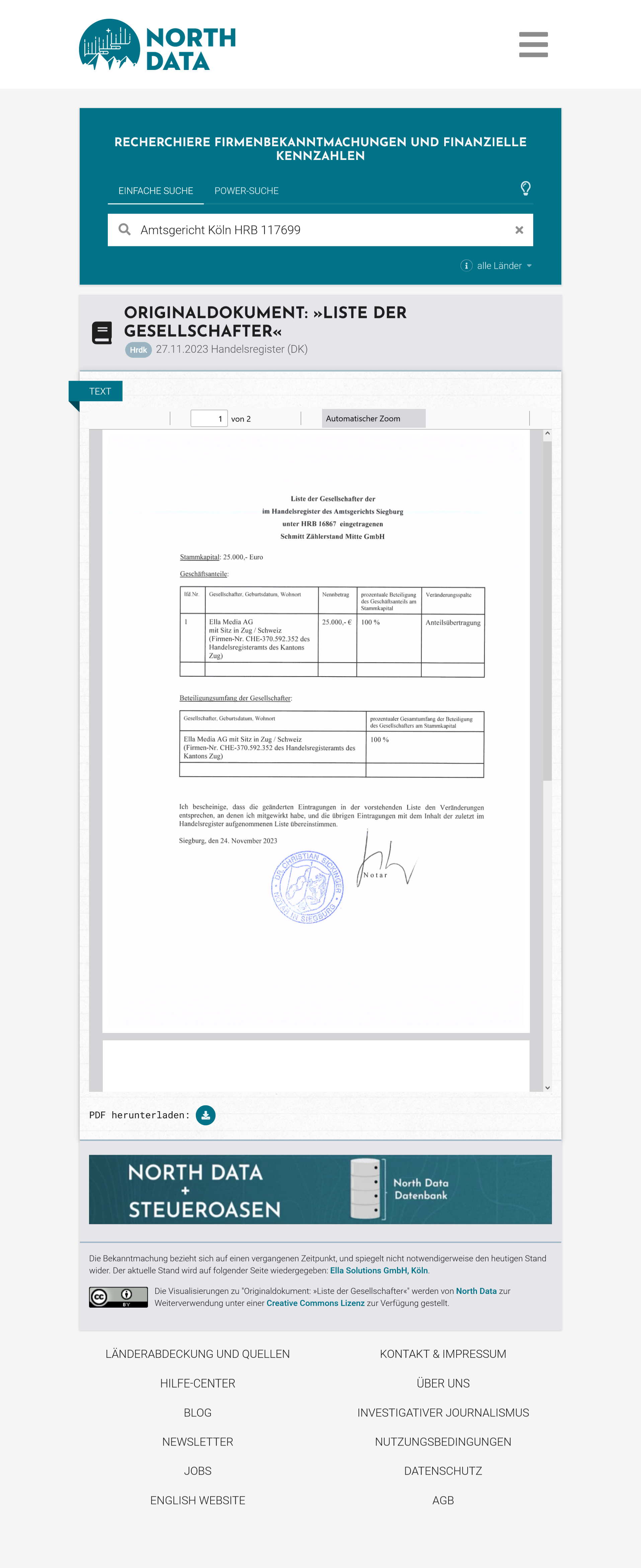 Auch hier mussten wir ja am heutigen Tage die Insolvenz vermelden, und natürlich schaut man dann einmal ins Unternehmensregister von northdata.de, um wichtige Dinge herauszufinden, die die Gesellschaft betreffen. Wichtig sind hier nicht nur Bilanzen, sondern auch, wer Gesellschafter dieser in die Insolvenz gegangenen Gesellschaft ist. Genau das haben wir getan und eben dann gesehen, dass dies die Ella Media AG aus der Schweiz ist. Auch hier, Herr Keusgen, muss man dann die Frage stellen, welche Auswirkungen diese Insolvenz auf das „Mutterunternehmen“ in der Schweiz hat. Ob Michael Keusgen dann eine Antwort geben wird, das wissen wir nicht, aber den Anlegern muss er jetzt Antworten geben, aber auch dem Vertrieb, denn der könnte, wenn das mit der Ella Media AG in der Schweiz schiefgehen sollte, gewaltig im Feuer stehen.