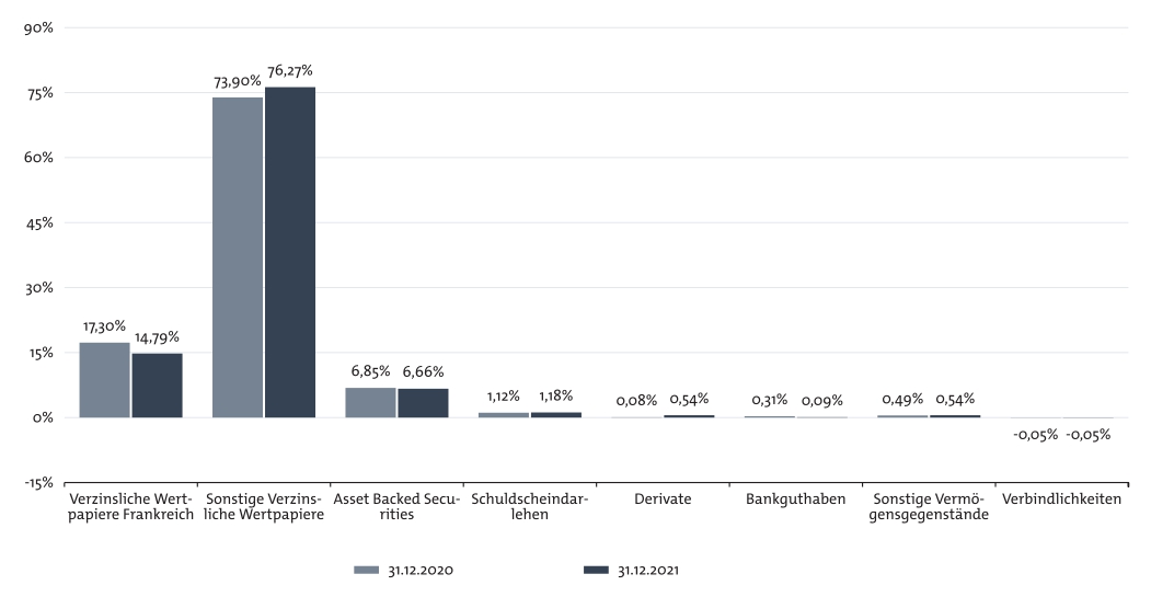 Zum Stichtag 31. Dezember 2021 erfolgte die Bewertung für das Sondervermögen zu 91,66 % auf Basis von handelbaren Kursen, zu 8,34 % auf Basis von geeigneten Bewertungsmodellen und zu 0 % auf Basis von sonstigen Bewertungsverfahren.