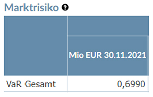 Der VaR Gesamt des Investmentvermögens zum Berichtszeitpunkt betrug 0,69%. Das Marktpreisrisiko ist somit als niedrig einzustufen.