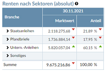 Mit Blick auf das aktive Laufzeitenmanagement war der Rentenanteil in Anbetracht der uneinheitlichen und volatilen Entwicklung der internationalen Anleihemärkte schwerpunktmäßig in Titeln mit mittlerer Restlaufzeit investiert, um den negativen Effekten wie Zins-/Renditeänderungen weniger stark ausgesetzt zu sein. Die durchschnittliche Restlaufzeit betrug 6 Jahre, bei einer Durchschnittsrendite von 0,6% (Stichtagsbezogene Durchschnittsrendite Ende November 2021; Quelle: HansaInvest).