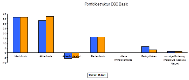 Die Struktur des Sondervermögens hat sich im Vergleich zum Vorjahr nicht wesentlich geändert. Indirekten Anlagen in Aktien-, Renten- und Mischfondsfonds sind weiterhin wesentlicher Bestandteil der Strategie. Der prozentuale Anstieg der Assetklasse Aktien, ist im Wesentlichen auf stärkere Kurssteigerungen dieser Anlageklasse gegenüber den anderen Anlagen zurückzuführen.