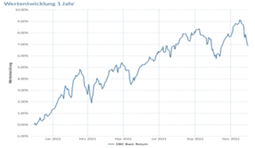 Das abgelaufene Geschäftsjahr 1. Dezember 2020 bis zum 30. November 2021 war weiter vom COVID 19 Erreger geprägt. Die Aktienmärkte setzten Ihre Erholung fort und bereits im Januar 2021 erreichte der deutsche Aktienindex DAX wieder die Stände vor dem Corona Crash im Februar und März 2020. Letztendlich verzeichnete der DAX im Geschäftsjahr eine Wertentwicklung von 12,87%, der amerikanische S&P500 sogar 26,55%. Hauptreiber dafür war in erster Linie die weltweite Konjunkturerholung der Volkswirtschaften nach dem extremen Einbruch aufgrund der Corona Pandemie. Trotz erster Signale der FED die zukünftige Geldpolitik straffer zu führen, verblieben die Zinsen insbesondere in Europa auf niedrigem Niveau. So bewegte sich die Rendite der 10-jährigen Bundesanleihe innerhalb des Geschäftsjahres von -0,6% auf ca. -0,3%. Berücksichtigt man die massiv angestiegene Inflation stieg der reale Kaufkraftverlust für Investoren in deutschen Staatspapieren nochmals deutlich an. Zu keinen Überraschungen führten die Wahlen in Deutschland. Ein Regierungswechsel war frühzeitig prognostiziert worden und von den Märkten ohne große Aufregung zur Kenntnis genommen worden.