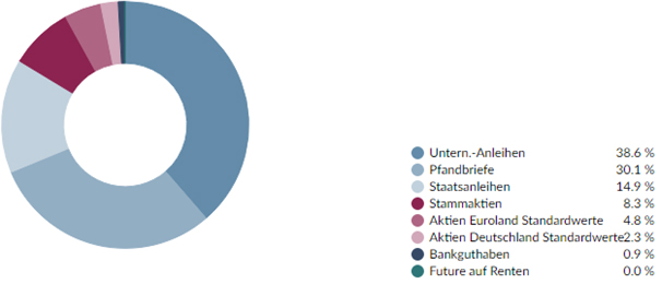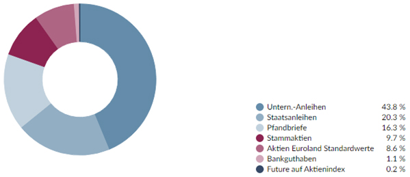 Zum Stichtag betrug die Allokation der Anleihen (ohne Berücksichtigung von Derivaten) 80,8%. Die einzelnen Anleihen stammen aus den Sektoren besicherte Anleihen, Staats- & Länderanleihen sowie aus ausgewählten Unternehmensanleihen. Die Quote von bis zu 20 Prozent in Aktieninvestments wurde im Wesentlichen über Einzelaktien sowie Fonds bzw. ETFs (Exchange Traded Funds) umgesetzt. Zum Geschäftsjahresende betrug die Aktienquote 18,4% und gliederte sich in Einzeltitel mit 9,8% sowie ETFs mit 8,6% auf.