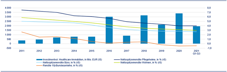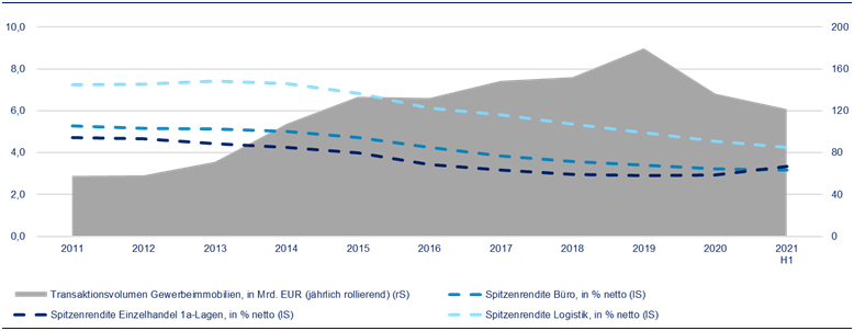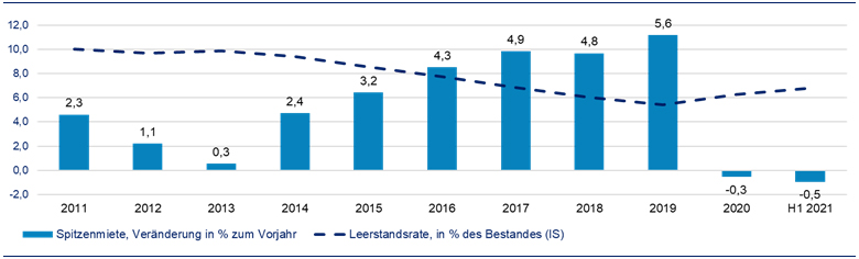 2. Gesamtwirtschaftliche Entwicklung im EuroraumNach einem starken Rückgang der Wirtschaftsleistung im Euroraum in 2020 um -6,5 % infolge der Covid-19-Pandemie hat im Jahr 2021 eine wirtschaftliche Erholung eingesetzt. Bis Jahresende wird in der Eurozone mit einem BIP-Wachstum von 5,0 % gerechnet (2022: +4,3 %). Das höchste Wachstum wird in Irland, Frankreich, Belgien und Spanien erwartet (Quelle: Consensus Economics). Die Inflationsrate im Euroraum ist seit Jahresbeginn deutlich gestiegen und lag im September bei 3,4 %. Die Veränderung des Verbraucherpreisindexes in Deutschland im Vergleich zum Vorjahresmonat betrug 4,1 %, was einem der höchsten Werte in der Eurozone entspricht (Quelle: EZB). Die Inflationsraten in Frankreich (2,2 %), den Niederlanden (2,7 %) und Österreich (3,3 %) fielen vergleichsweise niedriger aus (Quelle: OECD). Für 2022 wird im Euroraum mit einer Inflationsrate von 2,0 % gerechnet (Quelle: Consensus Economics). Trotz gestiegener Inflation hat die EZB den Leitzins bislang nicht erhöht und stellt dies derzeit auch nicht in Aussicht. Die Rahmenbedingungen für Finanzierungen im Immobiliensektor bleiben daher nach wie vor günstig. Mit einem neuen Jahreshöchstwert im Oktober 2021 zeichnet der Deutsche Hypo Immobilienklimaindex ein positives Bild für die Immobilienmärkte. Die Segmente Logistik und Wohnen werden von den Marktteilnehmern weiterhin als sehr gut beurteilt. Zudem zeigte insbesondere das Büroklima seit seinem Einbruch in 2020 eine sehr positive Entwicklung und bewegt sich seit September 2021 wieder im Expansionsbereich. Das Handelsklima wird zusammen mit dem Hotelklima insgesamt am schwächsten beurteilt. Seit Ende des Lockdowns Mitte des Jahres und den Impffortschritten haben jedoch beide Nutzungsarten wieder eine positive Entwicklung verzeichnet (Quelle: Deutsche Hypo, 10/2021). Das Stimmungsbild in der Immobilienbranche hat sich in diesem Jahr bislang positiv entwickelt. Insgesamt waren die Auswirkungen auf die Immobilieninvestmentmärkte im Vergleich zu vorherigen Wirtschaftskrisen relativ gering. Auf Seiten der Vermietungsmärkte zeigte sich je Nutzungsart aber eine differenzierte Entwicklung. Neben dem Risiko weiterer Einschränkungen durch pandemiebedinge Treiber stellen die schleppende Weltwirtschaft, die andauernden Störungen in den globalen Lieferketten sowie die Befürchtung einer anhaltenden Inflation derzeit die Kernrisiken dar. Immobilien-Investmentmärkte im Euroraum Das Transaktionsvolumen für Gewerbeimmobilien in der Eurozone erreichte in den vier Quartalen bis einschließlich Q2 2021 einen Wert von 122 Mrd. EUR und lag damit nur leicht unter dem Jahresendwert 2020 von 136 Mrd. EUR. Mit einem Investmentumsatz von 70 Mrd. Euro alleine im zweiten Quartal 2021 haben die europäischen Gewerbeinvestmentmärkte dabei wieder deutlich Fahrt aufgenommen. Die Spitzenrenditen (netto) für Büro- und Logistikimmobilien in Europa (ohne Großbritannien) haben im zweiten Quartal 2021 nochmals nachgegeben. Die Spitzenrendite für Handelsimmobilien in 1a Lagen blieb im bisherigen Jahresverlauf stabil. Trotz der im historischen Kontext weiterhin niedrigen Renditen und damit hohen Kaufpreise bieten Immobilien im Vergleich zu Anleihen auch in wirtschaftlich unsicheren Zeiten einen attraktiven Renditeaufschlag. Transaktionsvolumen Gewerbeimmobilien im Euroraum und Nettospitzenrenditen Büro, Einzelhandel 1a-Lagen, Logistik ![]() Quelle: PMA, Real I.S. AG Büromärkte im Euroraum In den Büromärkten traf bis 2019 eine hohe Nachfrage auf wenig verfügbare Flächen. Der Bedarf war in den letzten Jahren höher als der Zuwachs an Büroflächen, weshalb die Leerstände kontinuierlich zurückgegangen sind. Aufgrund der wirtschaftlichen Unsicherheiten infolge der Covid-19-Pandemie entwickelte sich die Büroflächennachfrage in 2020 jedoch verhalten. Diese Entwicklung setzte sich bislang auch in 2021 fort, sodass die durchschnittliche Leerstandsrate in den 15 Schlüsselmärkten im Euroraum bis zum Halbjahr 2021 um 51 Basispunkte auf 6,8 % weiter angestiegen ist. Auch das stetige Mietpreiswachstum der vergangenen Jahre ist durch die sich verändernden Marktbedingungen seit 2020 zum Erliegen gekommen. Entsprechend sind die Mieten bis zum Halbjahr 2021 im Durchschnitt der 15 Schlüsselmärkte im Euroraum um 0,5 % gesunken. Die Aktivitäten im deutschen Bürovermietungsmarkt waren im bisherigen Jahresverlauf 2021 weiterhin verhalten: Die sieben größten Büromärkte erzielten im ersten Halbjahr einen Flächenumsatz von 545.000 m2, was etwa dem Niveau des Vorjahreszeitraums entspricht, aber 12 % unter dem Halbjahreswert von 2019 liegt. Die Leerstandsraten sind um 100 Basispunkte gestiegen, liegen aber immer noch auf einem vergleichsweise niedrigen Niveau. Die Mietpreise blieben in den meisten Märkten stabil, in Köln sind die Mieten sogar leicht angestiegen (Quelle: PMA). Entwicklung Bürospitzenmieten und Büroflächenleerstände in 15 Schlüsselmärkten im Euroraum ![]() Quelle: PMA, Real I.S. AG Einzelhandelsmärkte im Euroraum Der stationäre Handel war bereits vor der Corona-Krise von einem Strukturwandel betroffen. Dabei nimmt der Anteil der online getätigten Käufe kontinuierlich zu und setzt den stationären Handel, besonders die Textilbranche, unter Druck. Die behördlich angeordneten Ladenschließungen von nicht-systemrelevanten stationären Einzelhändlern im Frühjahr 2020 und Winter 2020/21 sowie weitere Beschränkungen zur Eindämmung der Covid-19-Pandemie, haben dem Online Handel europaweit einen weiteren Schub versetzt, der sich auch in 2021 weiter fortsetzt. Dies spiegelt sich in allen europäischen Märkten in der Mietentwicklung der Innenstadtlagen und Shopping-Center wider und führte im Jahresverlauf 2021 zu weiter sinkenden Mietpreisen (Quelle: PMA). Weniger betroffen vom Strukturwandel und der Corona-Krise sind jedoch Immobilien zur Nahversorgung und Fachmärkte, insbesondere Lebensmittel- und Drogeriemärkte. Logistikmärkte im Eurorau