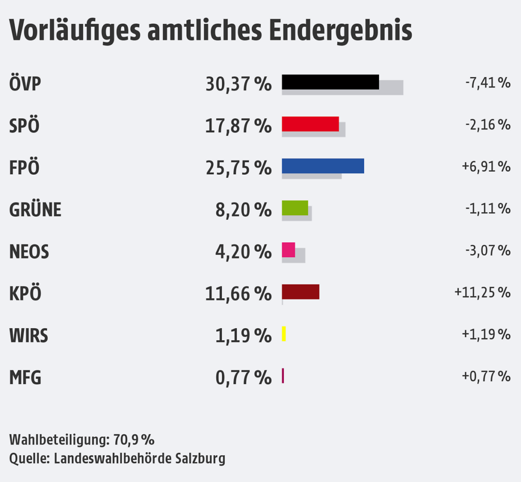 In Salzburg gab es am gestrigen Tage eine Landtagswahl, und die endete mit einer faustdicken Überraschung. Die ÖVP hat bei der Salzburger Landtagswahl am Sonntag eine empfindliche Niederlage erlitten. Zweitstärkste Kraft sind die Freiheitlichen, die ein Rekordergebnis im Bundesland einfuhren. Ein Sensationsergebnis schaffte die KPÖ Plus, die mit einer zweistelligen Prozentzahl in den Landtag einzieht.