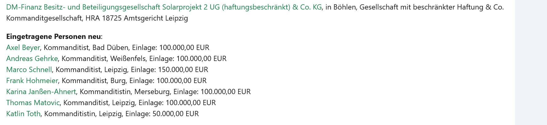 Die Gesellschaft wirkt wie eine zweckgebundene Projektgesellschaft für ein einzelnes (Solar-)Projekt mit überschaubarem Bilanzvolumen, wie häufig bei KG-Strukturen im Erneuerbare-Energien-Bereich.