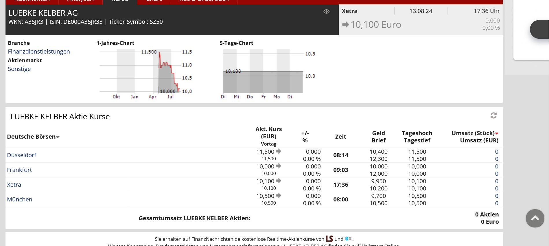 Auch das sicherlich ein gebrauchter Tag für das Unternehmen Lübke Kelber AG, denn geht es nachdem unten veröffentlichten Screenshot, dann gab es am heutigen Tage keine Nachfrage nach Aktien.