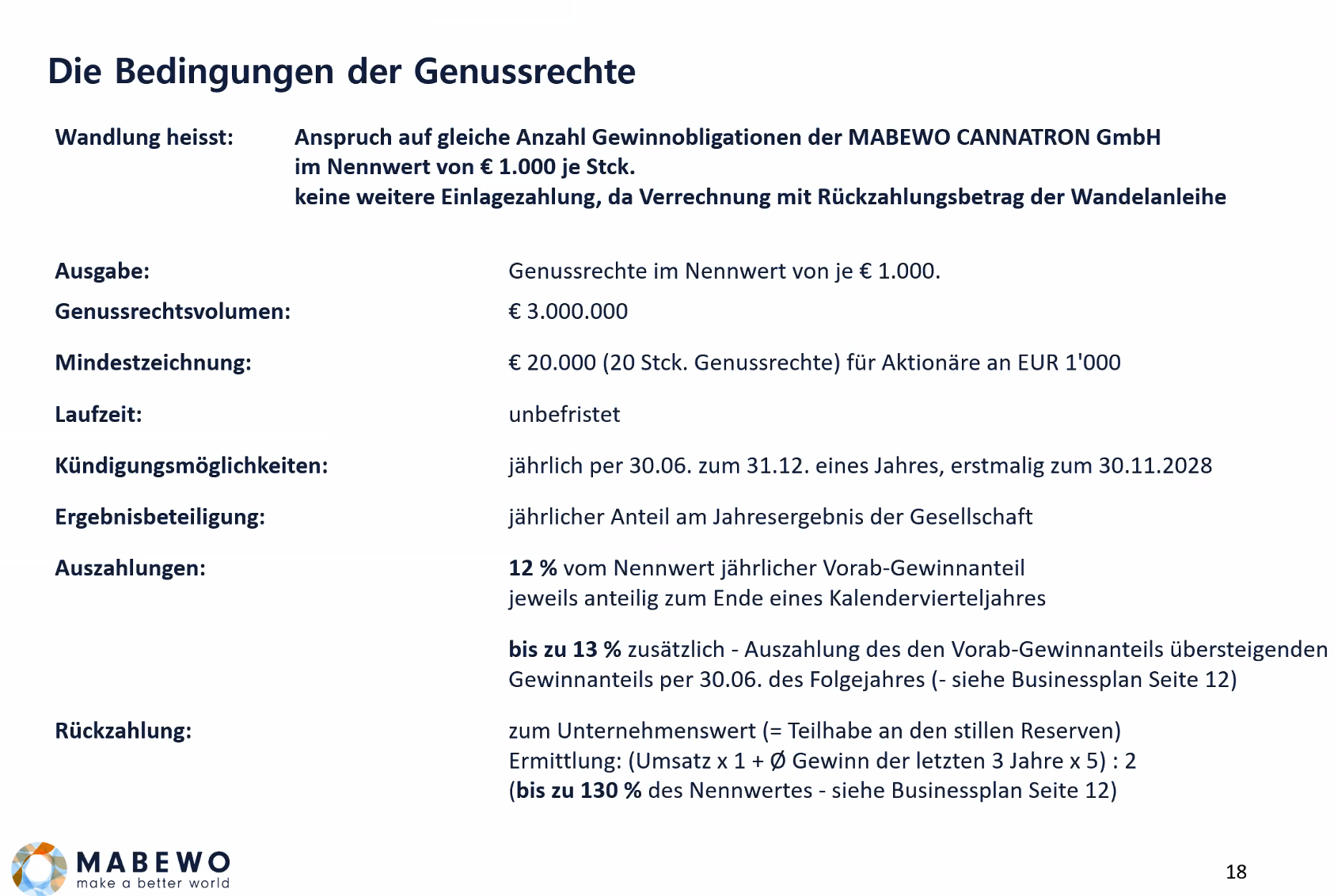 Das gilt natürlich auch für das Genussrechtsangebot der MABEWO Cannatron GmbH. Lassen Sie immer ein Beratungsprotokoll ausfüllen, auch wenn der Vermittler Soe auf eine digitale Zeichnungsmöglichkeit hinweist. Lassen Sie drain auch festhalten wofür das Geld verwendet wird udnlassen Sie darin vermerken, das das Unternehmen sich nicht in wirtschaftlichen Schwierigkiten befindet.