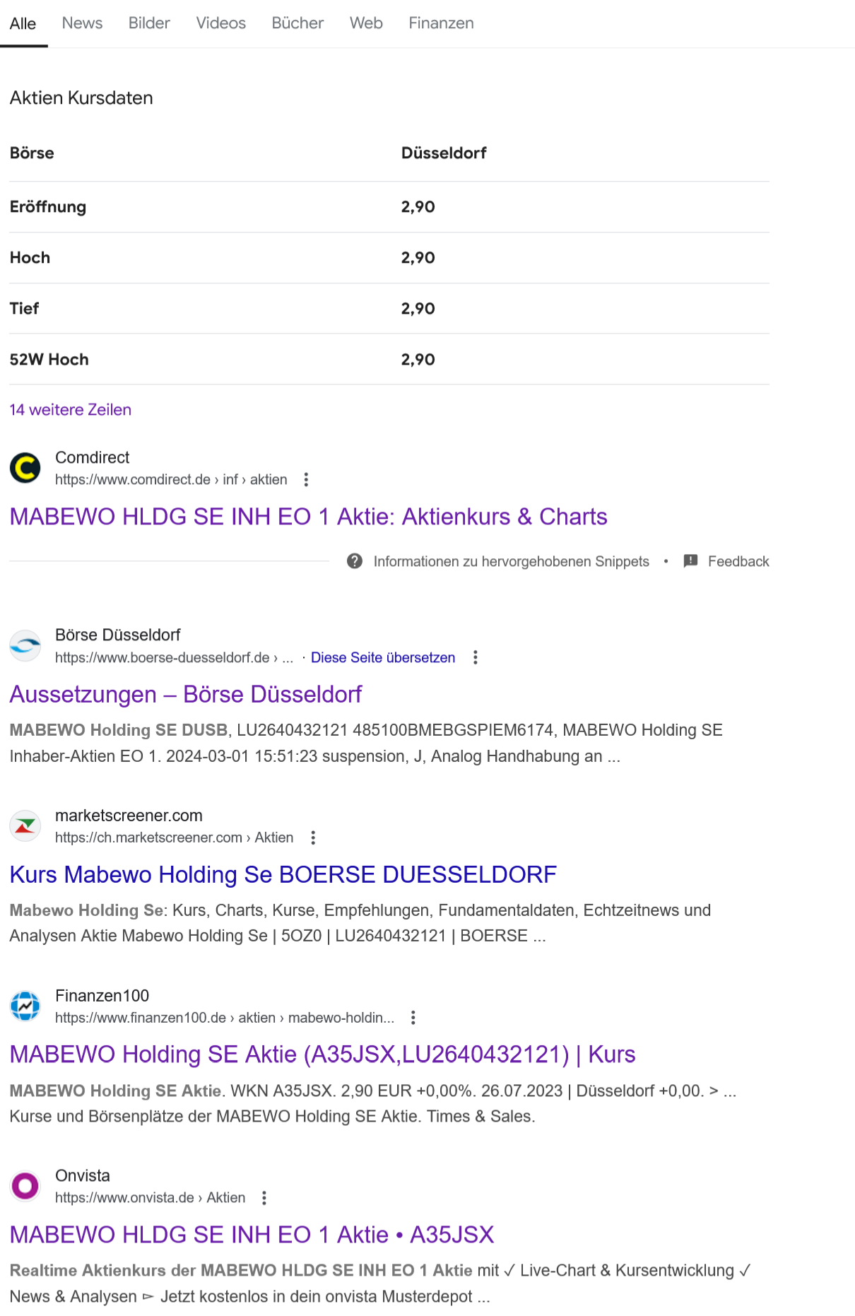 Ja schauen Sie genau hin, hier kann man sehen, das die Aktie der MABEWO Holding SE immer noch vom Handel an der Düsseldorfer Börse ausgesetzt ist. Das seit über 8 Monaten. Ganz ehrlich, einem Vorstand der die Notierung nach 8 Monaten immer noch nicht hinbekommen hat, der hat in solch einer Gesellschaft in diesem Job nichts zu suchen.