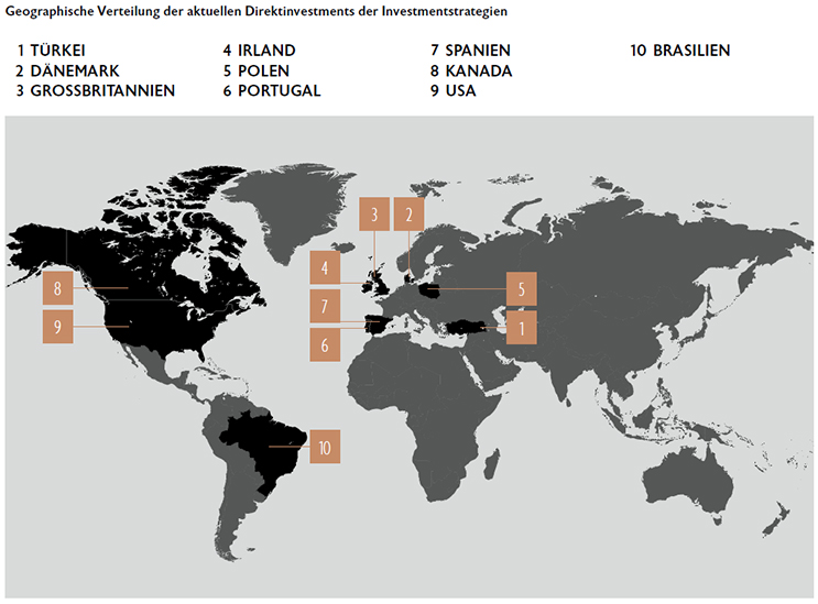 Die Diversifikation erfolgt dabei neben den Anlageklassen nach Ländern, Regionen, Sektoren und Investmentstilen, kombiniert mit unterschiedlichen Laufzeiten, Jahrgängen (Vintages) und individuellen Kernkompetenzen der jeweiligen lokalen institutionellen Fondsmanager. Investitionen in die Assetklasse Immobilien werden plangemäß innerhalb der Nutzungsarten „Gewerbliche Immobilien“ (schwerpunktmäßig Büro-, Einzelhandels-, Hotel-, Industrie- und Logistikimmobilien) und „Wohnimmobilien“ vorgenommen. Über ausgewählte institutionelle Investmentstrategien soll ein breit diversifiziertes Portfolio aus verschiedenen Immobilieninvestments (Immobilien, Beteiligungen, Immobilienobjekte,