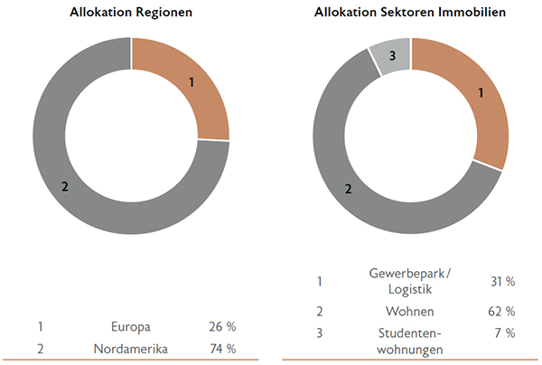 Die regionale Diversifikation verteilt sich zum Berichtsstichtag auf die Regionen Europa und Nordamerika. Die Anzahl der Direktinvestments der gezeichneten institutionellen Investmentstrategien liegt zum 31.12.2019 bei insgesamt 226. Eine weitere Diversifikation wird durch die Streuung auf verschiedene Bereiche des Sektors Immobilien sowie durch unterschiedliche Nutzungsarten und Nutzer sichergestellt.