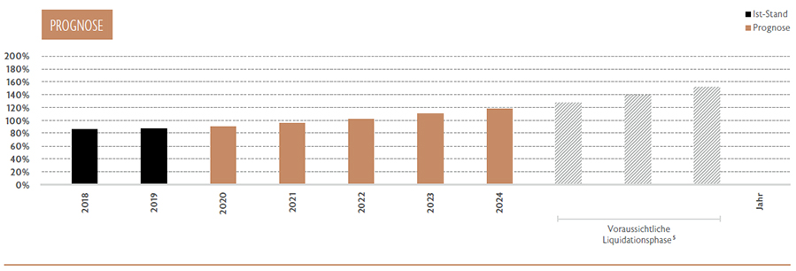 Der PRIVATE Fund 12 hat zum Berichtsstichtag keine Fremdfinanzierung aufgenommen. Auf Ebene der institutionellen Investmentstrategien beträgt die Fremdfinanzierungsquote über das Gesamtportfolio gerechnet 40,38 % 2. Am 31.12.2019 haben die institutionellen Investmentstrategien eine durchschnittliche Netto IRR 3 zum Stichtag von rund 6,05 % p. a. erwirtschaftet. Der TVPI 4 der institutionellen Investmentstrategien lag zum Stichtag bei 1,06. Es wird darauf hingewiesen, dass die bisherige Wertentwicklung kein Indikator für die zukünftige Wertentwicklung ist.