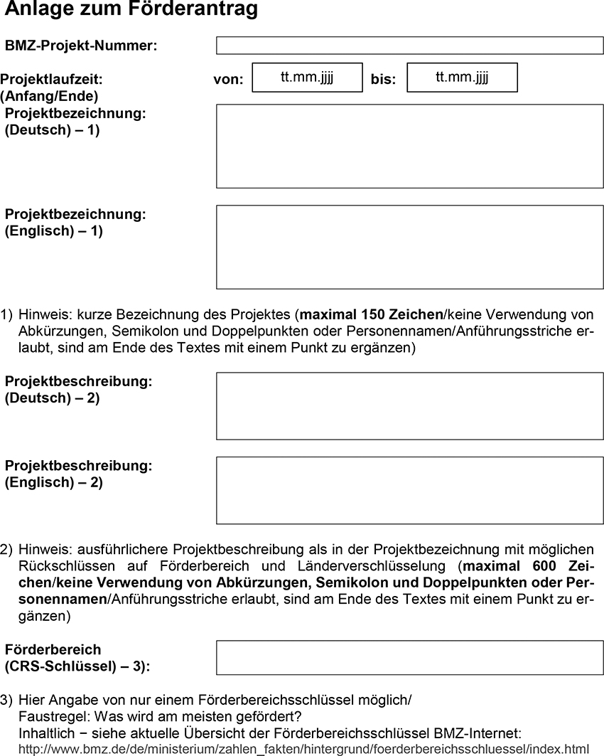 7.1 Projektvorschläge können dem BMZ in Form einer Projektskizze bis zu einem vom BMZ mitgeteilten Zeitpunkt unter Verwendung des dafür vorgesehenen Formats (siehe Anlage 1) vorgelegt werden. Bei positiver Rückmeldung kann nach Aufforderung des BMZ ein Antrag (siehe Anlage 2) eingereicht werden.