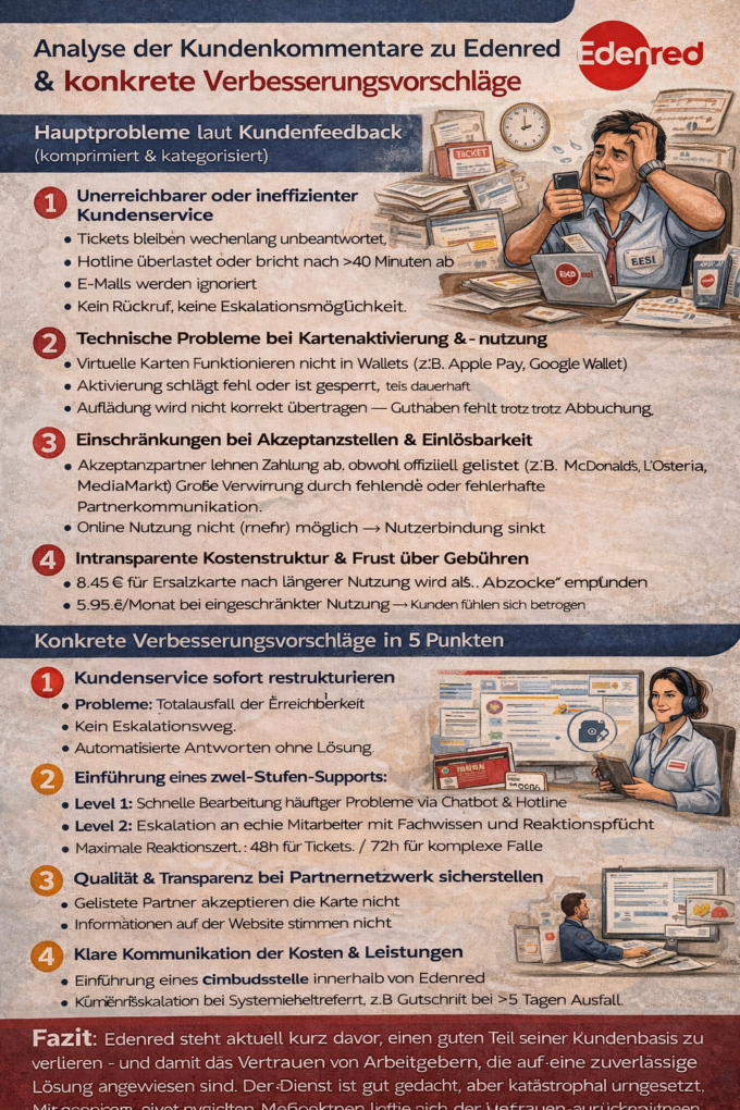 BeiDie RedaktionSonntag, 01.02.2026Analyse der Kundenkommentare zu Edenred & konkrete Verbesserungsvorschläge Hauptprobleme laut Kundenfeedback (komprimiert...