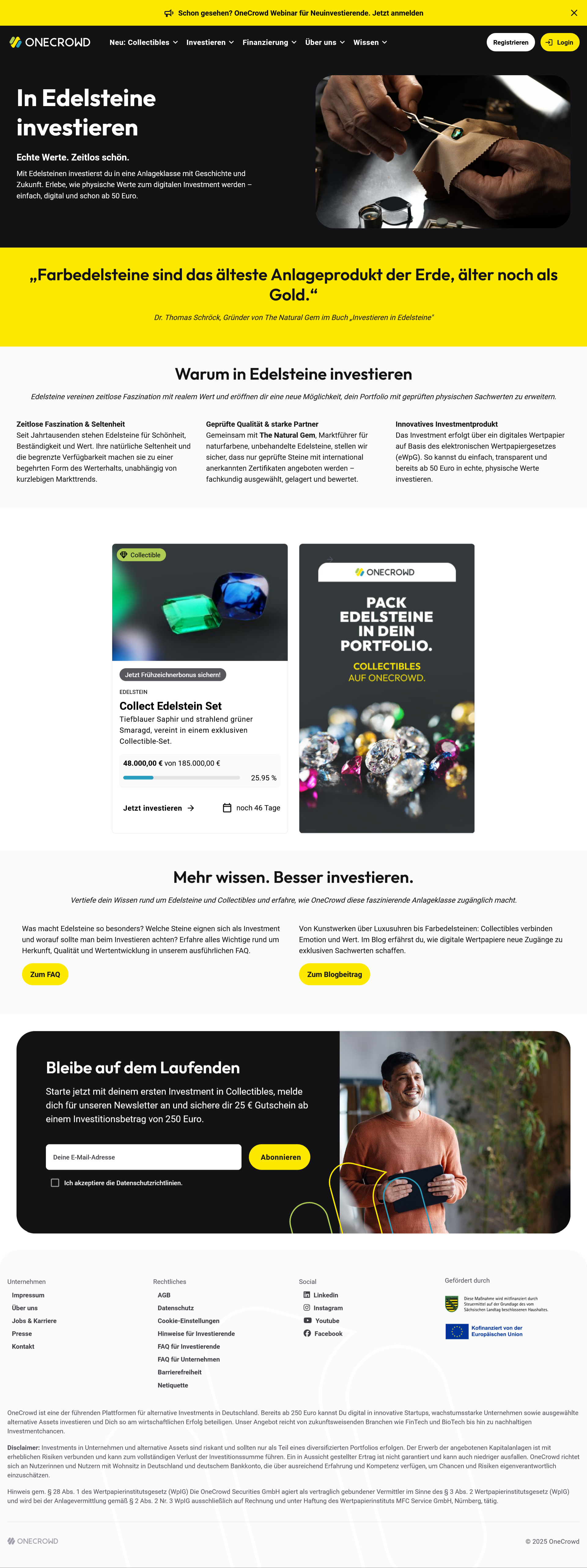 Eine berechtigte Frage aus unserer Sicht – besonders, wenn man sich das aktuell ins Auge fallende Angebot auf der Crowdfundingplattform OneCrowd (früher Seedmatch) ansieht. Hier bietet man dem Verbraucher bzw. Anleger Farbedelsteine und Diamanten als Investment an – Anlageformen, die aus meiner Sicht gerade für Kleinanleger nicht geeignet sind.