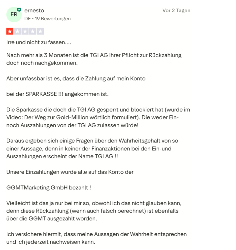 Es ist nicht der erste Hinweis das die TGI AG scheinbar Schwierigkeiten hat Geldtransfers zu gewährleisten. Auch wir könnn den faktischen Nachweis erbringen das ein Kunde Gold bei der TGI AG gekauft hatte, das Geld aber auf das Konto einer österreischichen Immobilienforma überwiesen werde sollte. Da muss man schonmal über das Thema Geldwäsche nachdenken dürfen Herr Kaltenegger, oder sehen Sie das anders?