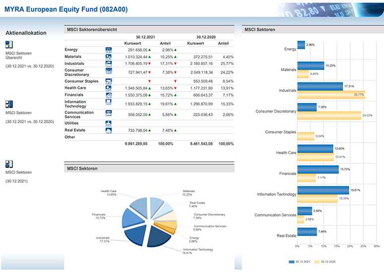 Im Berichtszeitraum wurde unsere europäische Aktienstrategie gemäß der MYRA Active Stock Selection Strategie (MASS) umgesetzt. Der MYRA European Equity Fund ist ausschließlich in europäischen Aktien investiert. Der Fonds hat die angestrebte konzentrierte, zugleich aber diversifizierte Struktur umgesetzt, womit die momentum-basierte Strategie ein hohes Active Share gegenüber dem Vergleichsindex STOXX 600 Europe aufweist. Die Kassequote bewegte sich im Berichtszeitraum nahezu ausschließlich unter 5%, sodass sich der MYRA European Equity Fund als ein long-only Baustein zur idealen Ergänzung eines diversifizierten Aktienportfolios anbietet.