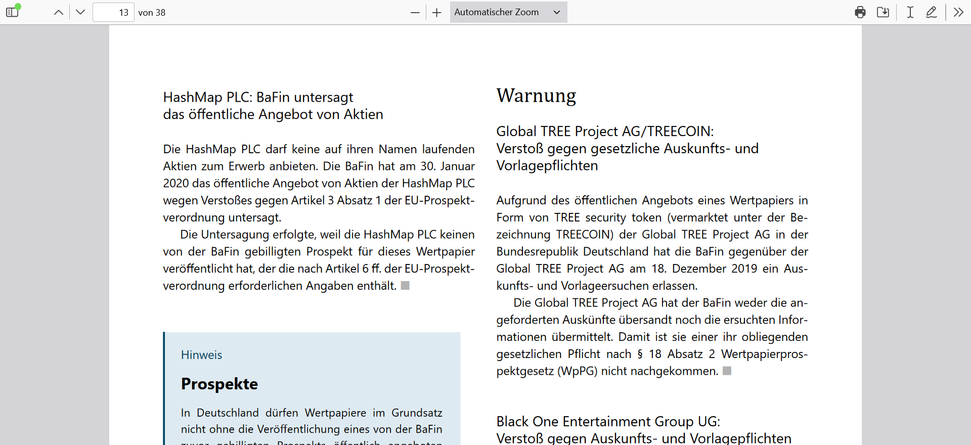 So kann man es auch heute noch auf der Seite der Bafin, im BafInjournal Februar 2020 nachlesen, und alleine dieser Hinweis sollte dann Anlegern sicherlich zum Nachdenlen anregen, wenn man mit dem Gedanken gespielt hat, dort möglicherweise ein Investment zu tätigen, udn ganz ehrlich, wir kennen bis zum heutigen Tage kein vond er BaFin gestattetes Prospekt. Warum eigentlich nicht, sehr geehrter Jörg Heinrich Schääfer, wenn da lles in Ordnung ist?