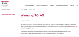 Die Finanzmarktaufsicht (FMA) Liechtenstein weist darauf hin, dass die „TGI AG, Städtle 33, 9490 Vaduz“ über keine aufsichtsrechtliche Bewilligung oder Registrierung der FMA verfügt und daher nicht im offiziellen Register (register.fma-li.li) der FMA aufgeführt ist.