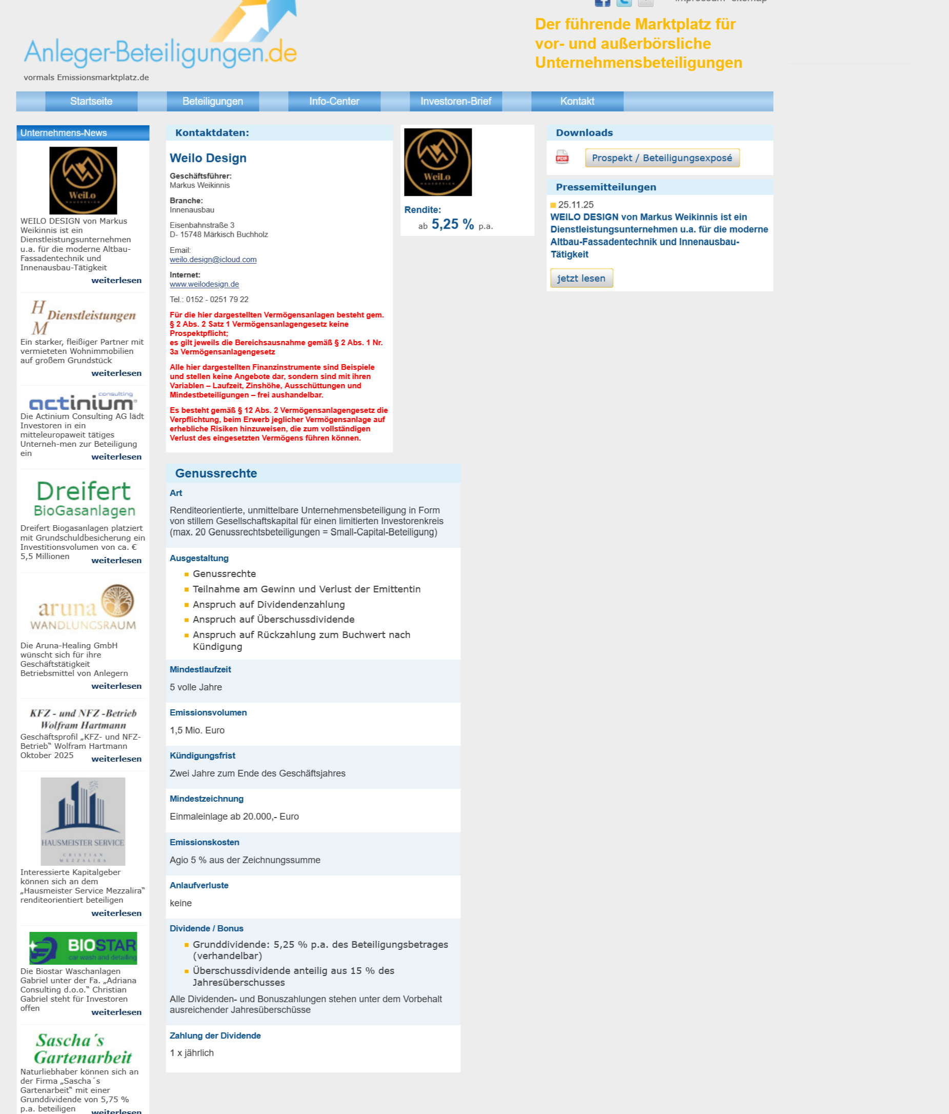 Die Firma mit Sitz in der Eisenbahnstraße 3, 15748 Märkisch Buchholz, ist in der Innenausbau- und Altbau-Fassadentechnik tätig. Angeboten wird eine Beteiligung mit einer Mindestlaufzeit von fünf Jahren und einer angestrebten Grunddividende ab 5,25 % p.a., zzgl. möglicher Überschussbeteiligung – abhängig vom Jahresgewinn des Unternehmens.