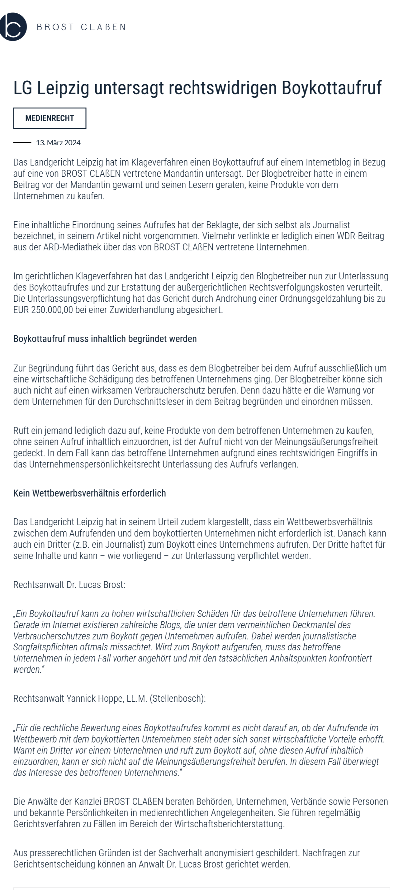 Man könnte natürlich auch einmal Ihre Berufsvertretung fragen, ob eine solche Werbung in der Form, ohne Ergänzung über das Endurteil in dem Verfahren, so zulässig ist. Das finde ich dann eine spannende Frage Herr Dr. Brost. Machen wir mal, oder?