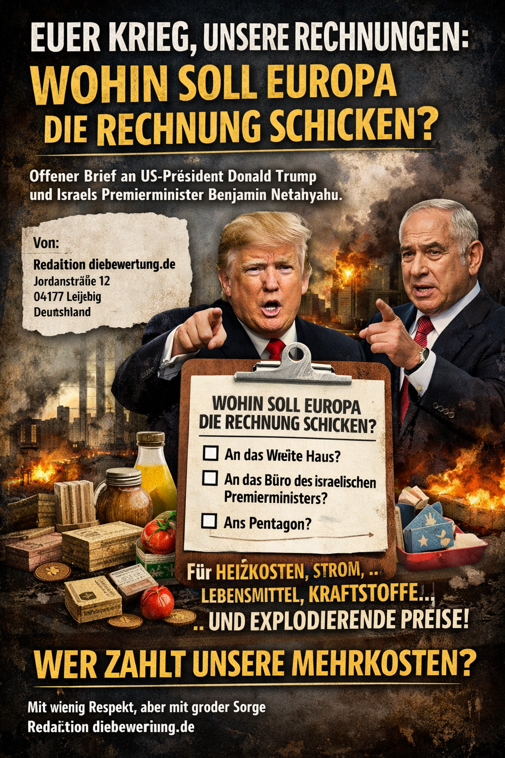 Wohin sollen Europas Bürger die Rechnung für die Mehrkosten schicken, die durch Ihren Krieg entstanden sind – und wann genau beabsichtigen Sie, diese zu bezahlen?